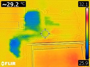 室内の壁をサーモグラフィーで確認すると、やはりベランダと屋根の取合い付近で雨漏れしていました。