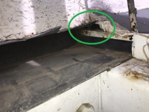ベランダの床を解体すると、下屋根との取合いに隙間が生じていました。