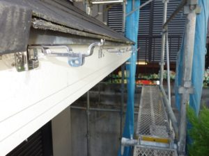 既存の軒樋を解体後、新しい吊り金具を取付けていきます。