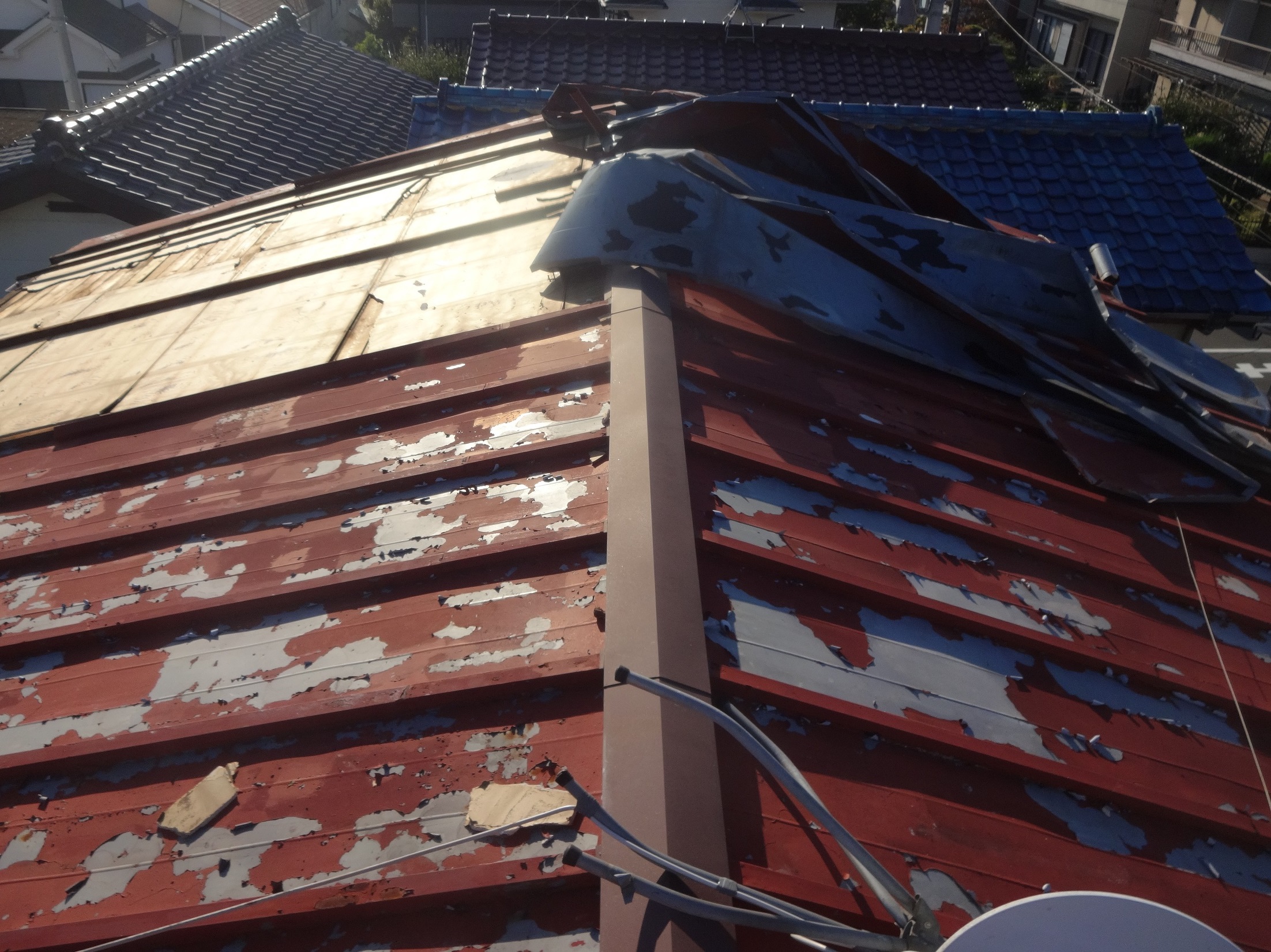 トタン屋根(瓦棒)は劣化すると強風で剥がれてしまうことが多いです。このように屋根が剥がれると防水シートも一緒に傷めて雨漏りします。