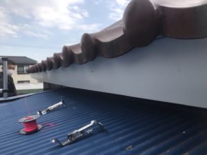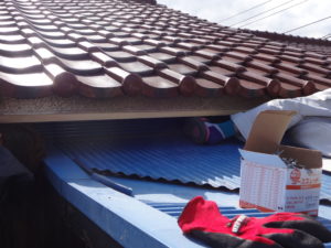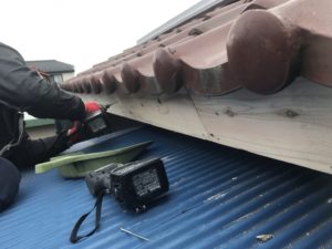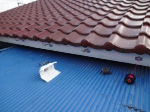板金の設置後に、水糸を使用して雨樋の金具を取付けていきます。