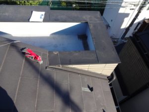 FRP防水の塗膜が劣化していたので、一緒にトップコート防水を行っていきました。