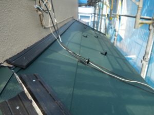 新しい屋根材を取付けて、壁際に雨押え板金を設置していきます。