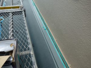 棟包み設置後、壁取合いにマスキングにて養生を行い、コーキングを打っていきます。
