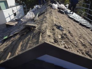粘土瓦と一緒に、葺き土と瓦桟も撤去していきます。