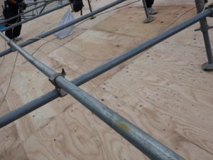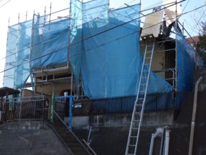 屋根工事に入る前に、安全面と飛散防止の養生のため「仮設足場」を組んでいきます。