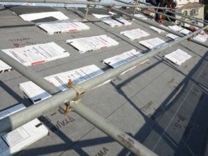 ベニヤを新設後に防水シートをタッカーで止めて張り上げていきます。