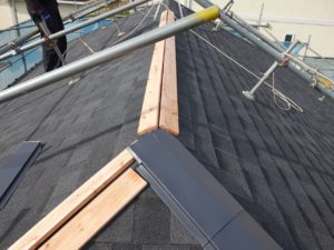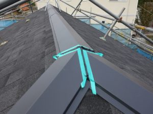 下地の貫板を取付けて、上にガルバリウム鋼板の棟包みを取付けます。