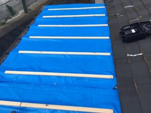 そのため、胴縁でブルーシートを押え、雨漏りと剥がれの対策をしています。