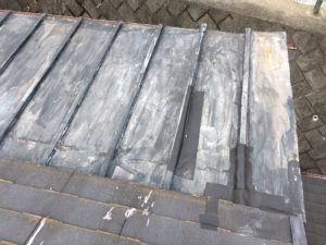 増改築部分の屋根との取合いに、水切りを設置して仕上げていきます。