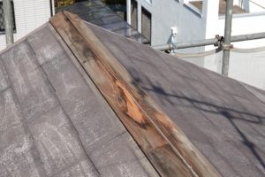 屋根の中央部にある棟板金という役物は、強風時に飛ばされたり、剥がれたりして雨漏りの原因となる場合もあります。