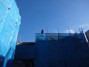 足場のメッシュシート(養生シート)がありますが、風などの影響で細心の注意を払っていても、飛散してしまうことがあるためです。