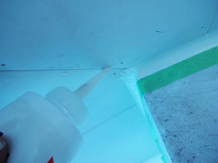 タッカーの穴や、ケイカル板の継ぎ目に「パテやコークボンド」を打って下地調整を行っていきます。