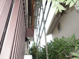 軒天張替えと瓦補修にあたり、仮設足場を設置していきます。