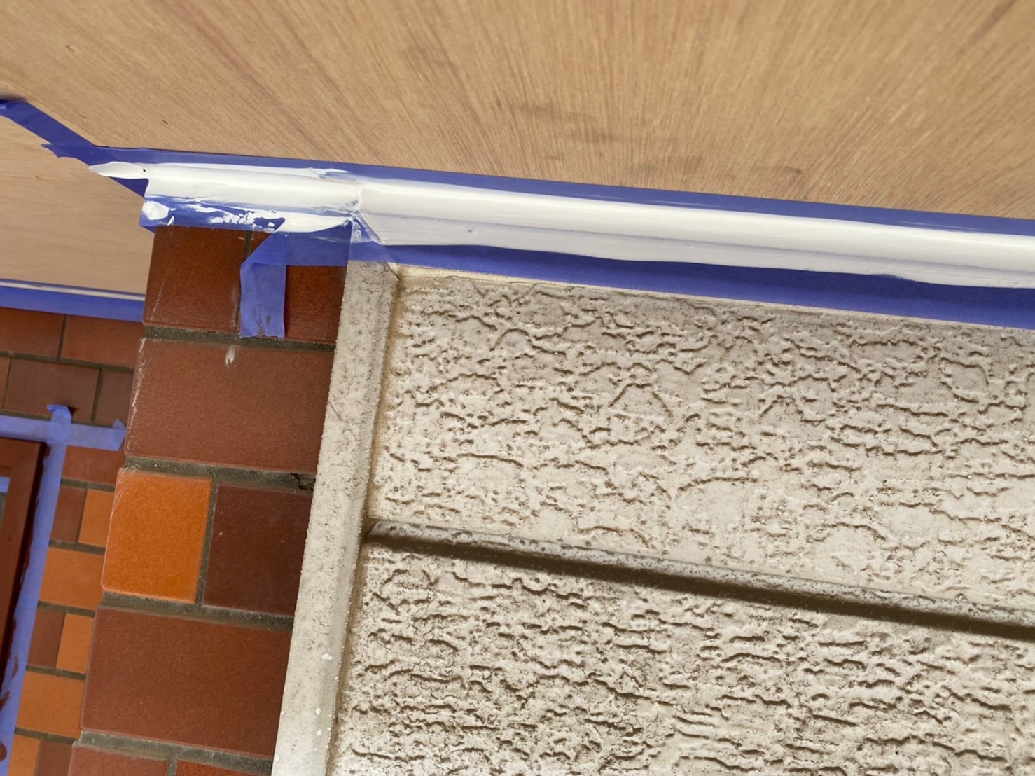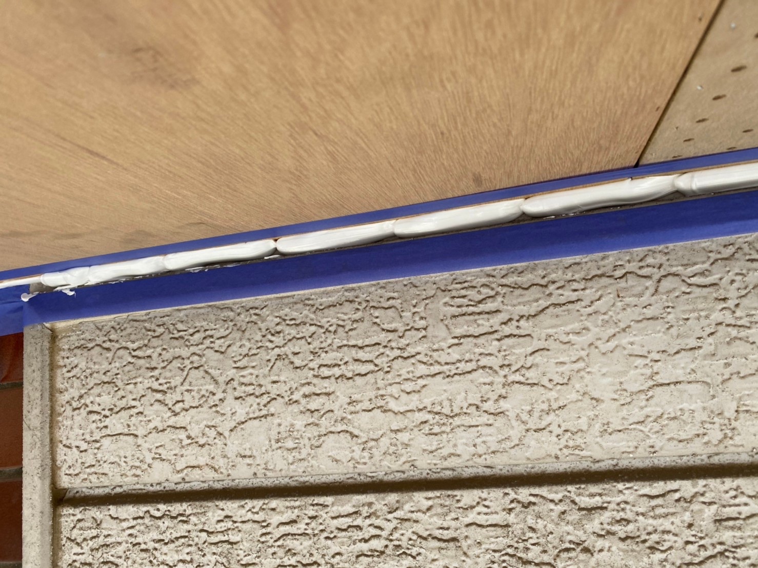 軒天井の塗装作業に入る前に外壁との取り合いにコーキングをします。