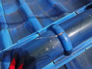 漆喰の劣化と一緒に、銅線(緊結線)が切れている場合が多いです。この銅線が切れていると、簡単に棟瓦(丸瓦)が外れてしまいます。