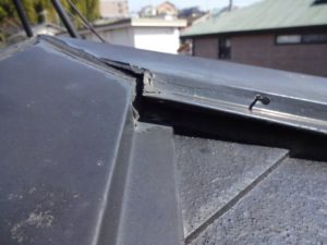 棟板金の下地が傷み、釘が浮きコーキングも劣化して棟板金が浮きあがっています。