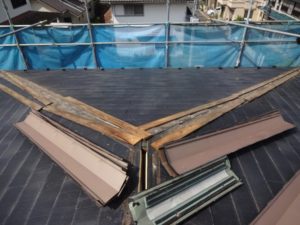 大屋根同様に棟等の役物を解体後、防水シートを張り、新規屋根材を張っていきます。