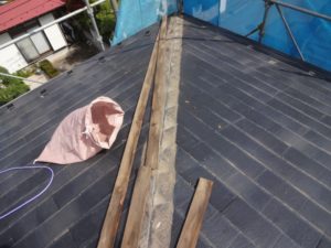 全体的に新規屋根材を張り終えたら棟の下地(タフモック)を取付けていきます。