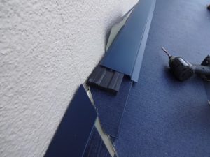 外壁との取合い部分に、雨押え板金を取付けていきます。