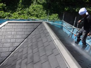 今回は、外壁塗装と一緒の施工のため、高圧洗浄で屋根のコケや汚れを綺麗に洗い流していきました。