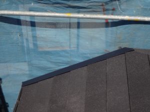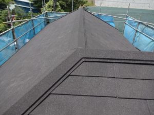 先ほどのタフモックに同質の棟カバーを取付けて、取合いにコーキングを塗っていきます。