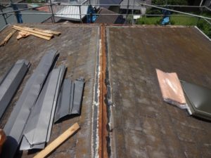 雨押えの撤去後、防水シートと唐草を取付けていきます。