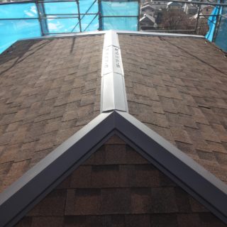 新規ガルバリウム鋼板(フッ素)の取付け後、棟板金の下地を取付けていきます。