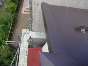 玄関上の屋根も大屋根と同様にガルバリム鋼板(フッ素)でカバー工法で仕上げていきました。