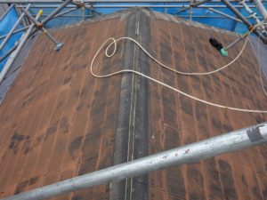 ですが、今回の屋根勾配は7寸勾配あり、棟を補修するためには「仮設足場と屋根足場」を設置する必要がありました。