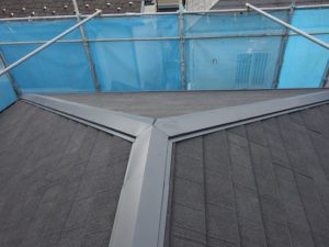 棟板金の取合いに、コーキングを充填して防水処理を行っていきます。
