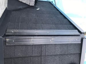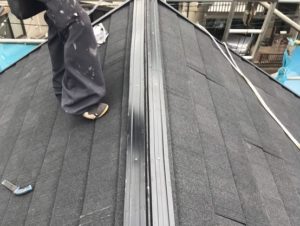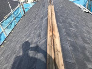 新しい屋根材を張り終えたら、中央部分に「棟板金の下地」を新設していきます。