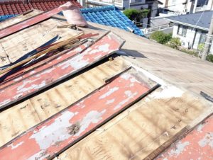 古い屋根材を解体後、清掃を行い新規ベニヤを張っていきます。