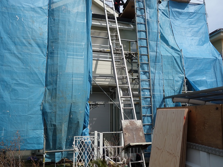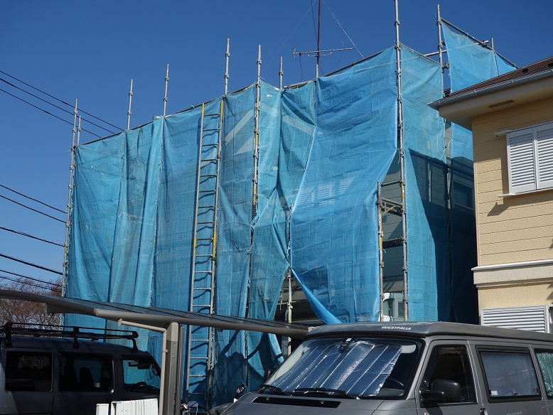屋根葺き替え工事を行う前に、屋根作業に必要な仮設足場を組んでいきます。