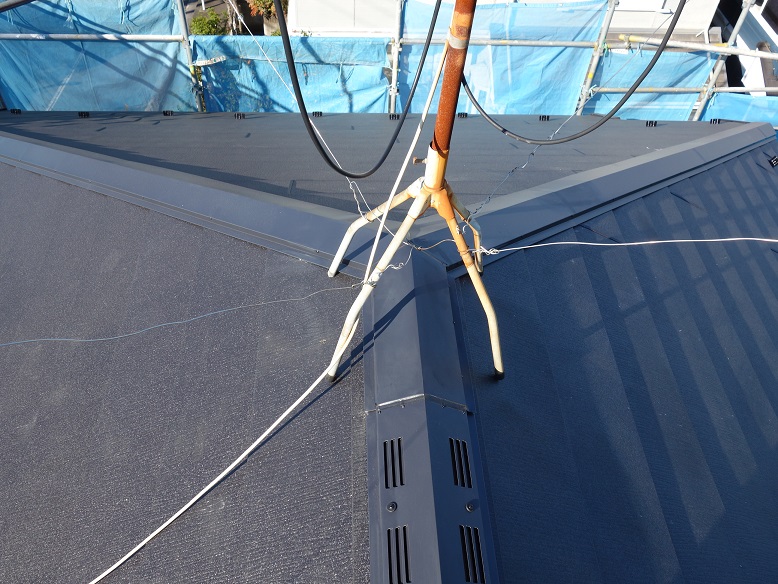 屋根材本体を上部まで取付け後、棟板金を取付けていきます。