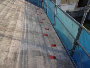 本塗りの塗料が密着しやすいように、劣化した屋根材にシーラーをしっかりと染み込ませます。
