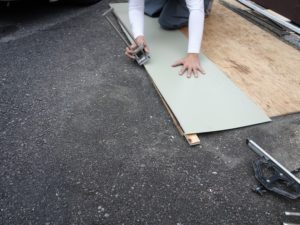 出窓板金のカバー工事では、まず新しい「野地板(構造用合板)を上張り」していきます。