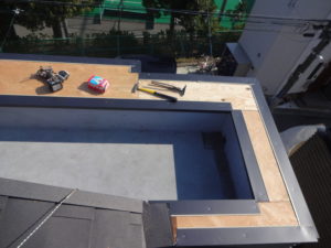 FRP防水の塗膜が劣化していたので、一緒にトップコート防水を行っていきました。