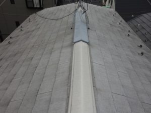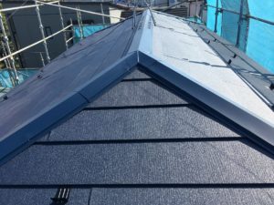 最後に、棟板金の取合いにもコーキングを打ち、仕上げます。