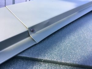 壁取り合いに、雨押え板金を設置して、コーキングを打ち完了です。