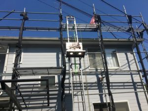屋根カバー工事の施工前に「仮設足場」を設置していきます。