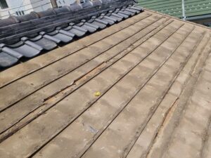 雨漏り発生箇所のちょうど真上の屋根部分となります。瓦がある状態ではどこから雨漏りしているかわかりません。