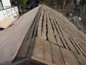 既存の粘土瓦の解体撤去が完了して清掃を行ったら、新規ベニヤを張っていきます。
