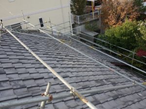 屋根勾配は、7寸ありましたので屋根足場も設置しています。