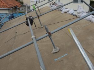 屋根工事に入る前に、安全面と飛散防止の養生のため「仮設足場」を組んでいきます。