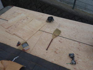 ベニヤ張り後、防水シートを張っていきます。