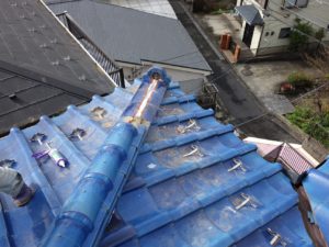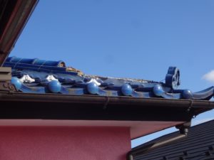 先日の台風で、棟の瓦が崩れて落下したため部分的な修理を行っています。