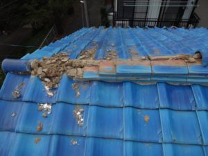 棟瓦の銅線が切れて、漆喰が劣化すると棟瓦は崩れやすいです。先日の台風で、このような同じ被害のお問い合わせを数十件いただきました。