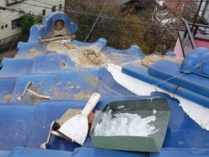 棟瓦の崩れが原因で瓦が落下して、下の玄関屋根の瓦も割れてしまいました。