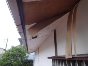 台風の影響で、軒天ベニヤが剥がれていました。